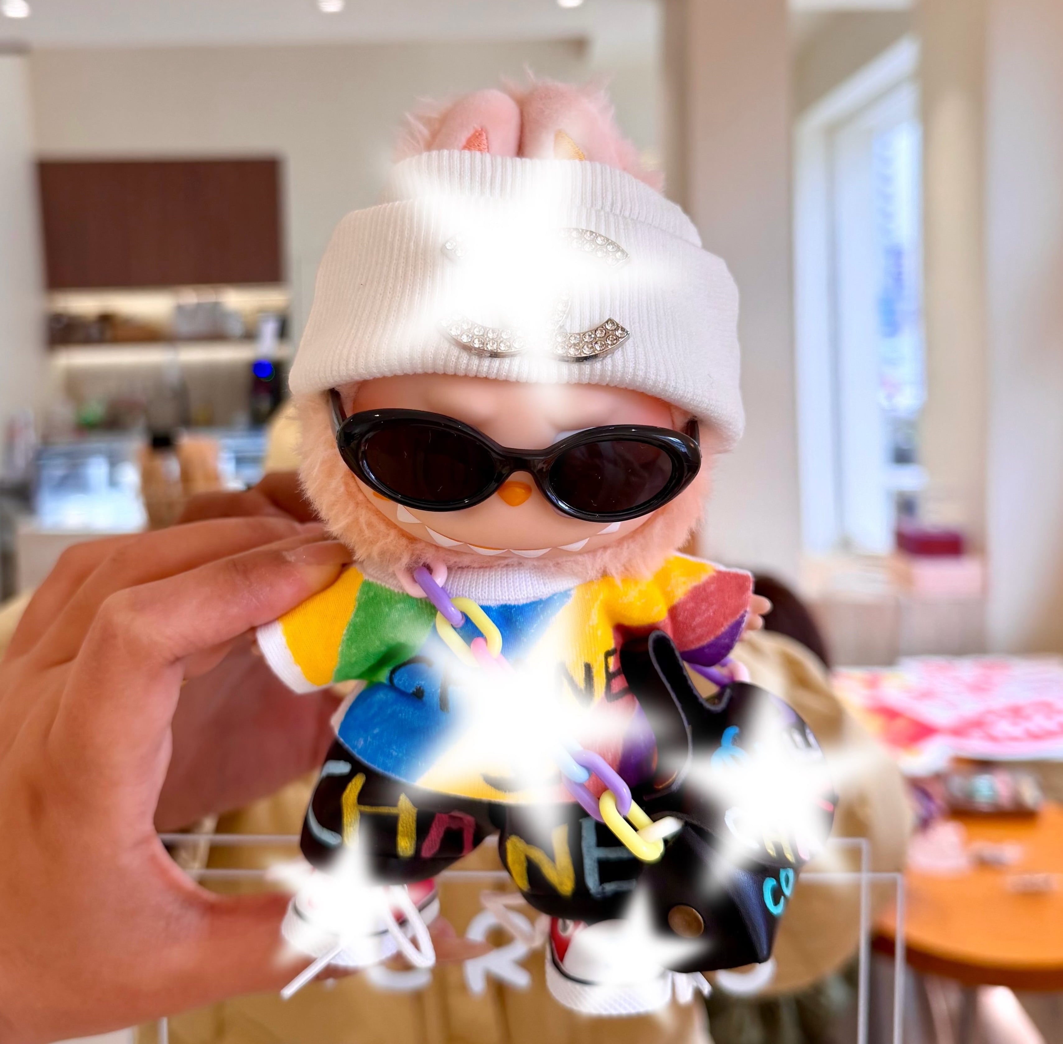 ラブブ 1-3代用 カラフルグラフィティ トップス+パンツ+帽子+靴+バッグ+メガネ Labubuぬいぐるみ 着せ替え服 6点セット