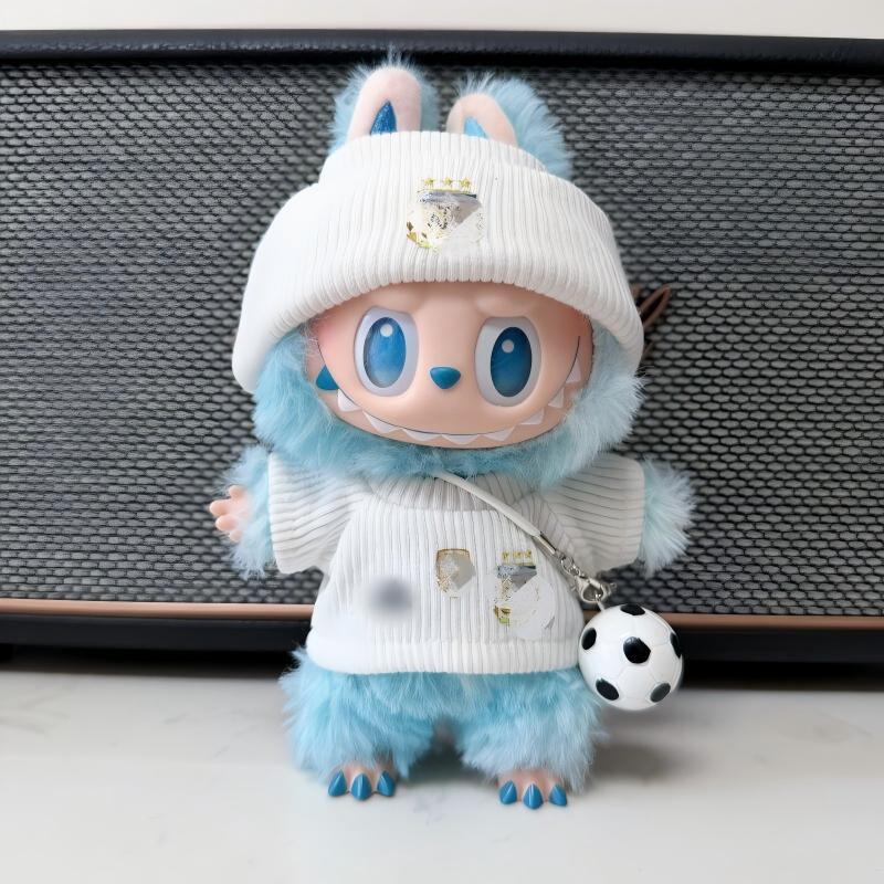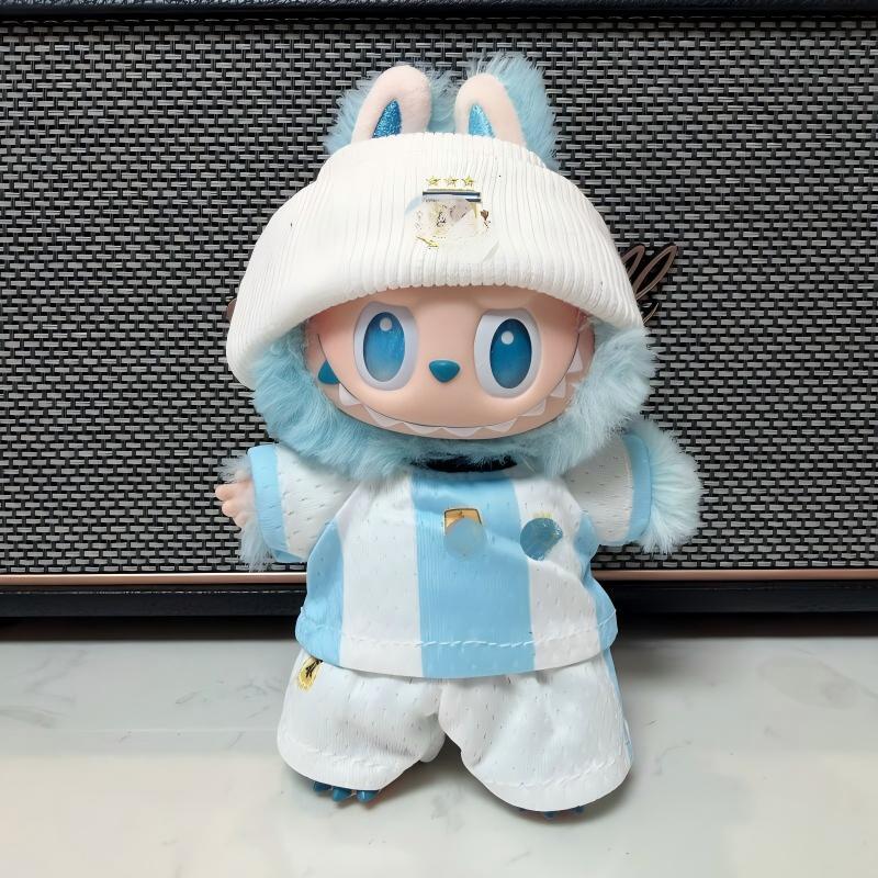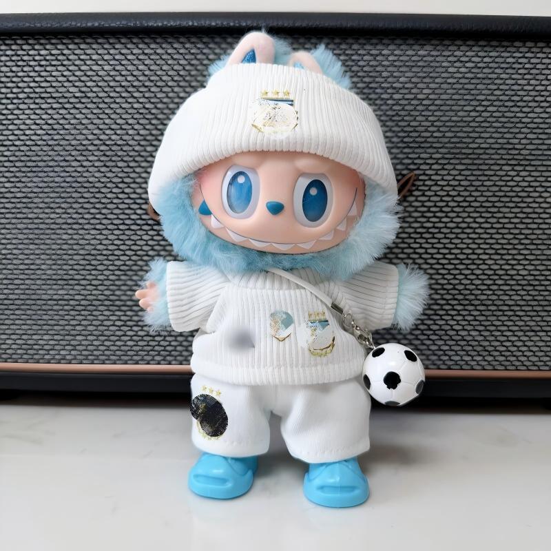 Labubu 1-3世代用 サッカー トップス+パンツ+帽子+靴+ボールチャーム ラブブ ぬいぐるみ 着せ替え服 5点セット ブルー/ホワイト