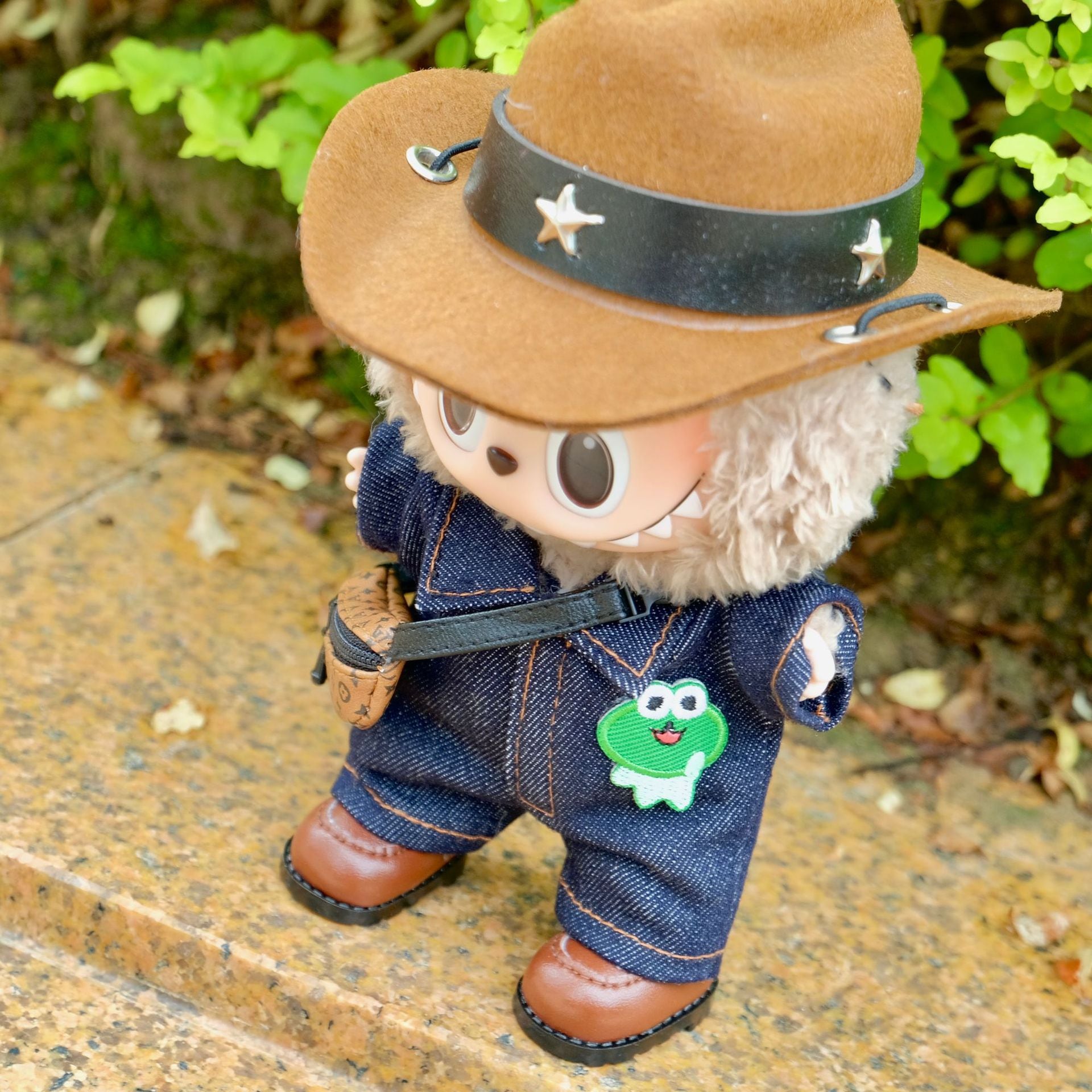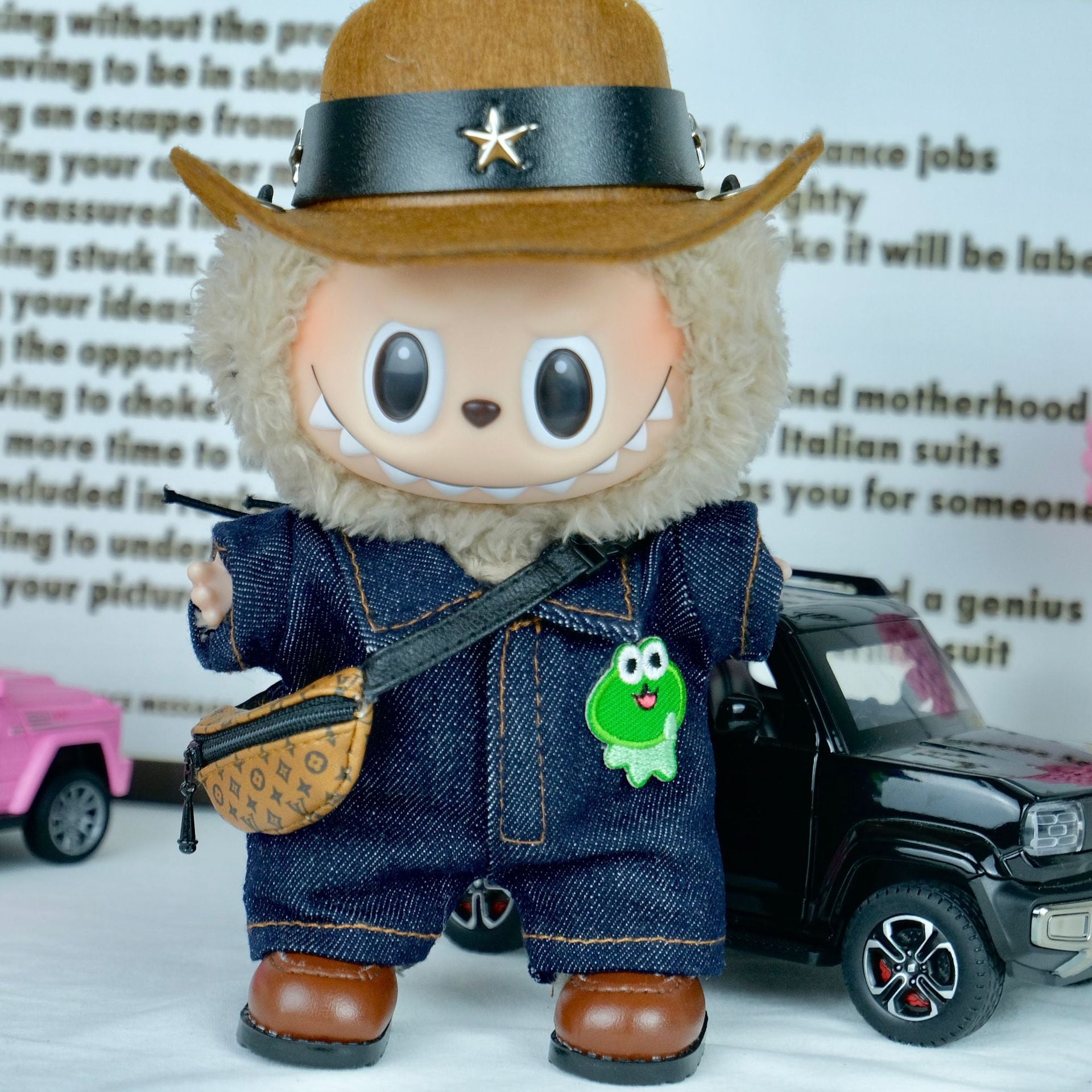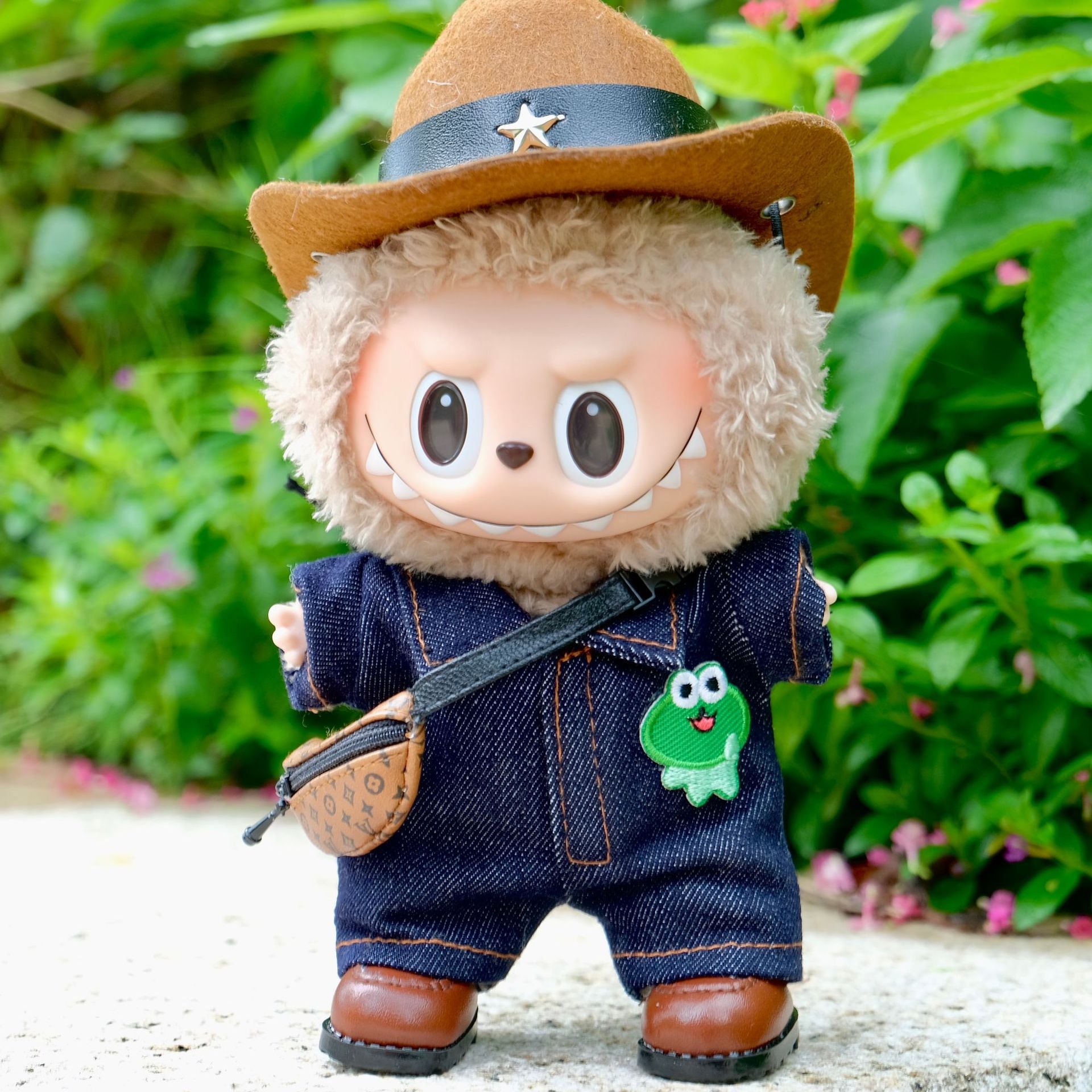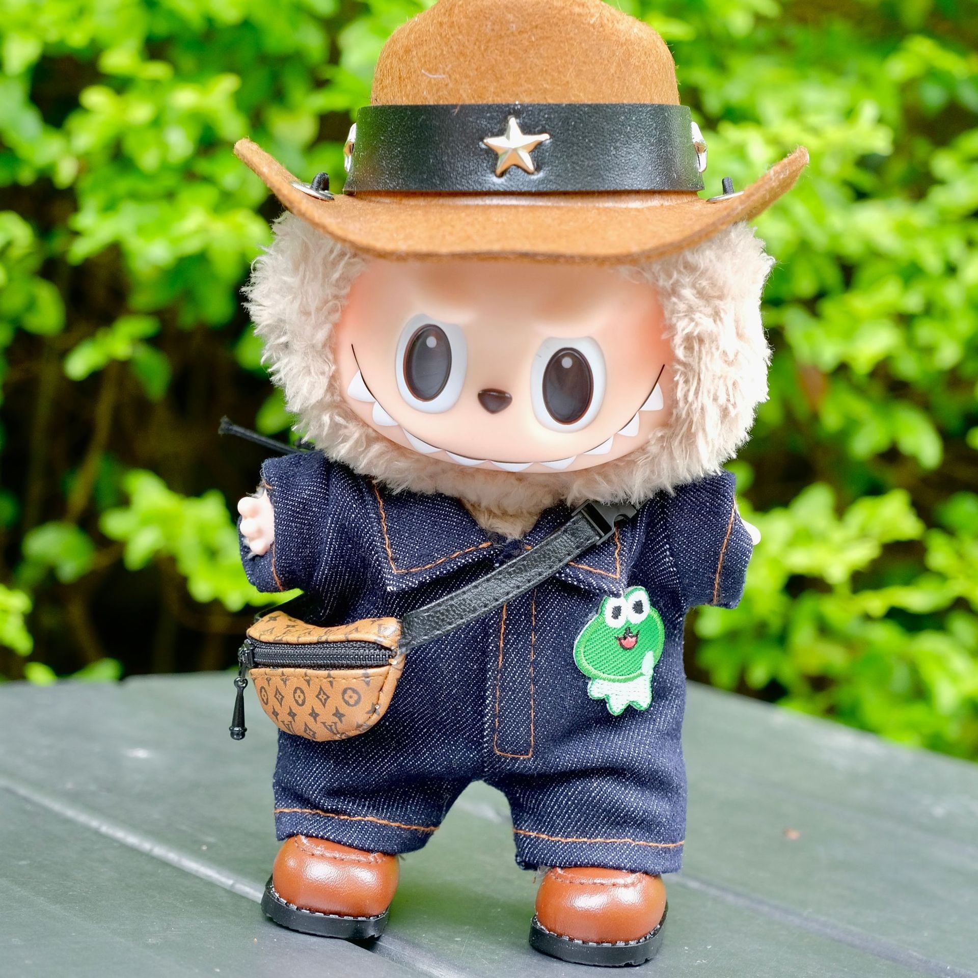 Labubu 1-3世代用 カジュアル デニムオーバーオール+ハット+バッグ+靴 ラブブ ぬいぐるみ おしゃれ 着せ替え服 4点セット